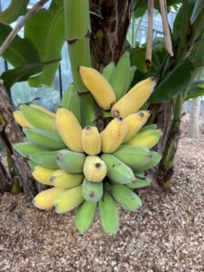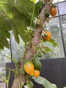 Feuchtwarme Luft und der intensive Duft nach tropischem Regenwald umfängt die Besucher im Gewächshaus. Bananen, Bergpapaya, Kaktus, Chili, Kurkuma und Ingwer – hier wachsen tropische Pflanzen, die ursprünglich in den Regenwäldern rund um den Äquator beheimatet sind.
