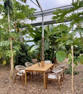 Im April 2025 eröffnete das Tropencafé. Hier sitzen die Gäste bequem unter Palmen und Bananenstauden oder draußen auf der Sonnenterasse mit weitem Blick über die Felder in die Berge. Die ganze Familie Pritzl und Mitarbeiter stehen hinter der Theke, um Köstlichkeiten wie Papayaspritz und Pinsa, Kaffee und Kuchen zu servieren. Das Café ist nur drei Nachmittage in der Woche geöffnet, weil man den Pflanzen dann wieder Zeit geben muss, um sich zu regenerieren. Denn für die Besucher wird die Luftfeuchtigkeit von normalerweise 100 % deutlich herunterreguliert. So feucht-heiß und tropisch wollen es die meisten Gäste dann doch wieder nicht, auch wenn es schon ein ganz besonderes Erlebnis ist, in Bayern an einem klirrend kalten Wintertag unter Bananenstauden einen Drink zu sich zu nehmen.