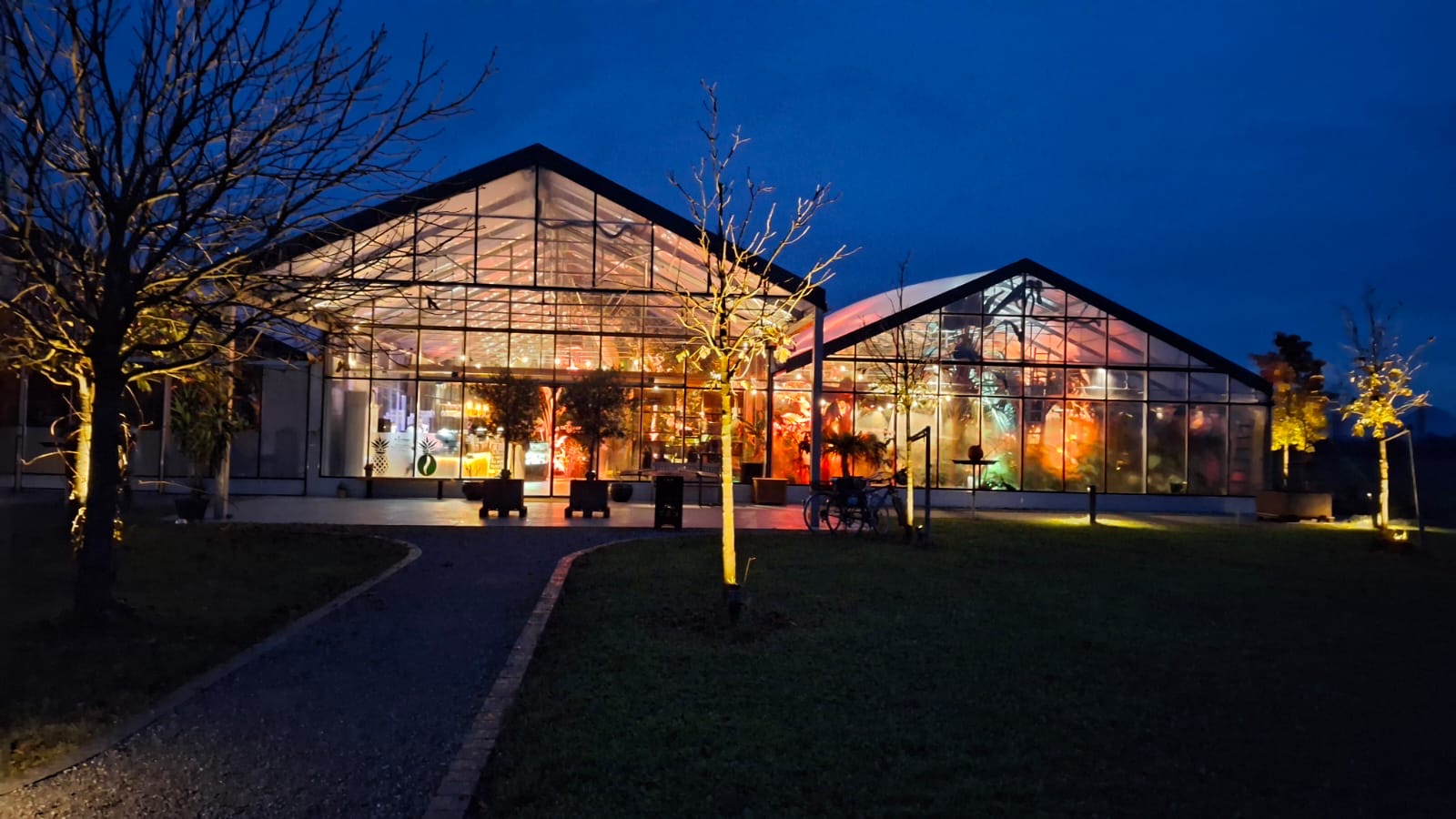 Am frühen Abend, wenn es draußen dunkel wird, verwandelt sich das Café in einen besonders magischen Ort, weil die großen Blätter der tropischen Pflanzen bunt angestrahlt werden.