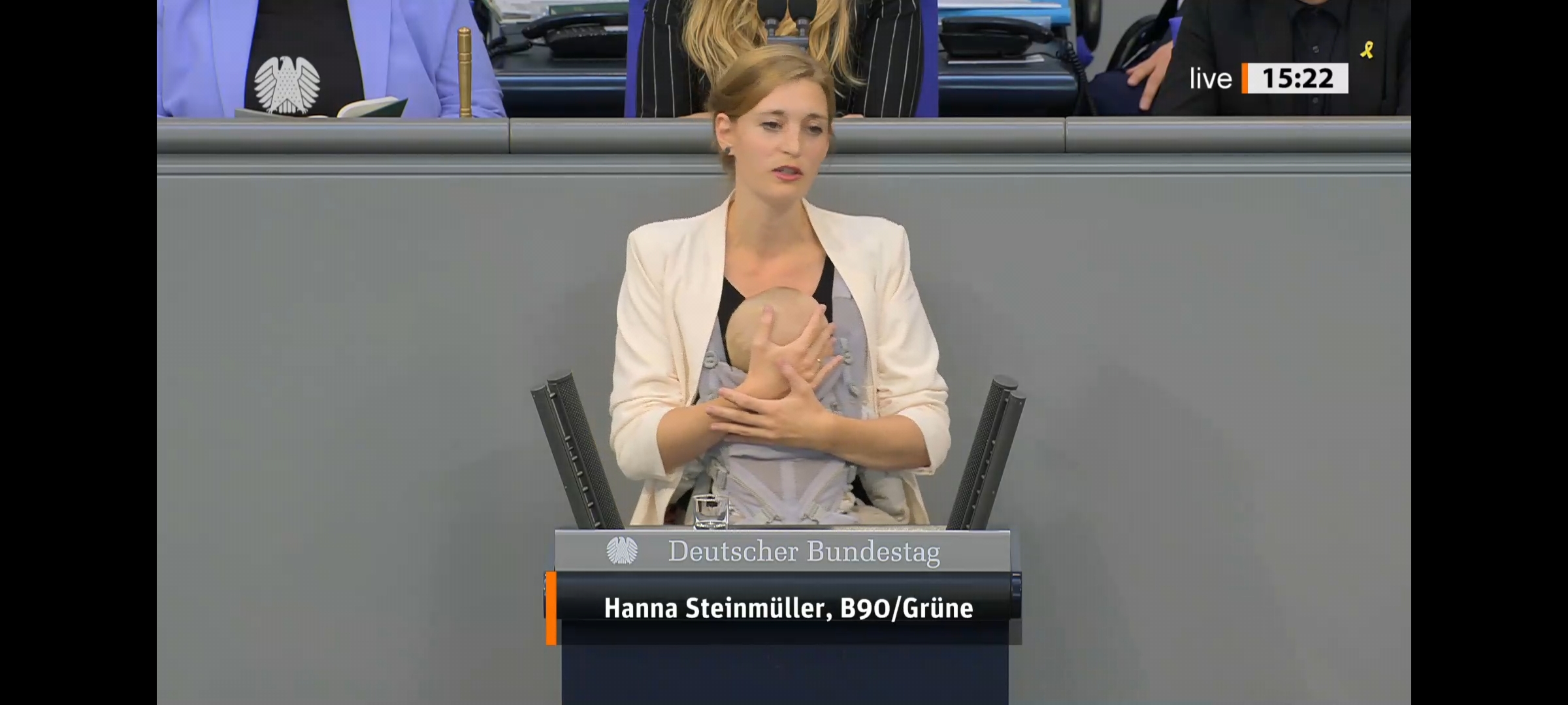 Zumindest hat seit dieser Legislaturperiode die Bundestagspräsidentin Julia Klöckner erlaubt, Säuglinge mit in den Plenarsaal zu nehmen und die Bundestagsabgeordnete Hanna Steinmüller (Bündnis 90/Die Grünen) hat mit der ersten Rede mit Säugling am 23.9.25 Bundestagsgeschichte geschrieben.